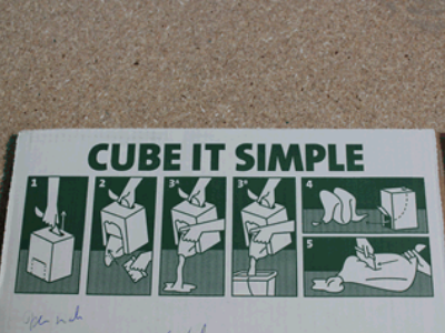 Aan de bovenkant en zijkant van de doos zitten verschillende stippellijnen. De ene stippellijn is bedoeld als handvat, door de andere stippellijn komt het materiaal vanuit de zak naar buiten. Druk de stippellijnen door.